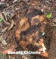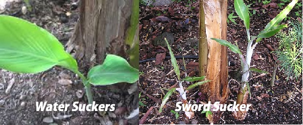 The banana crop grows through these rhizomes and suckers like sword suckers and water suckers. Sword suckers have a well-developed base with narrow sword-shaped leaf blades at the early stages which are superficially attached to mother rhizomes. Water sucker possesses broad leaves and is not superficially attached to mother rhizomes, which do not produce healthy banana clumps. Suckers of 2-4 months of age are selected.