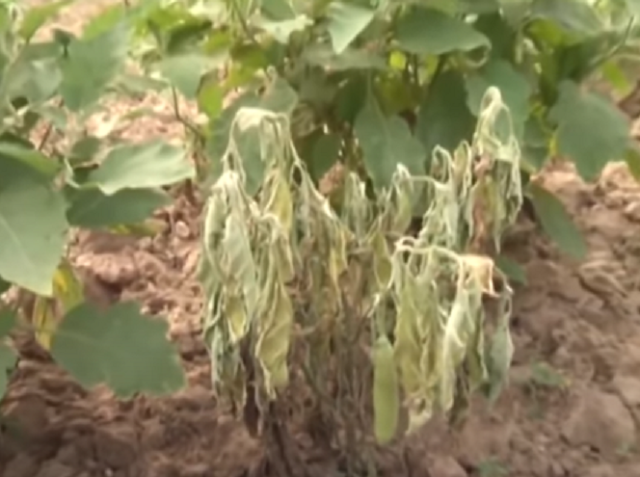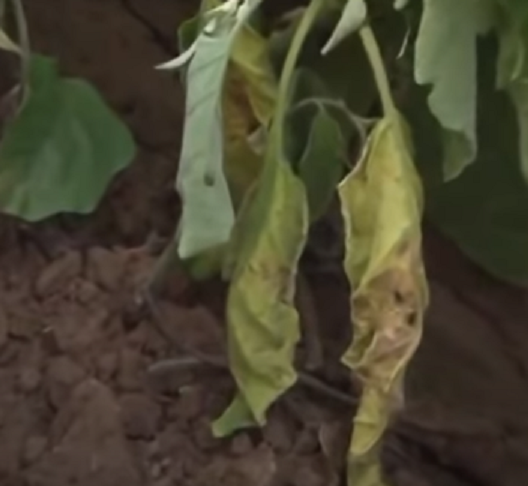 The characteristic symptoms include wilting of the foliage followed by the collapse of the entire plant. The wilting is characterized by dropping and slight yellowing of leaves and vascular discoloration. Drying of plants at the time of flowering and fruiting are also characteristic of the disease condition. The affected cut stems pieces when dipped in water, a white milky stream of bacteria oozes out which is the diagnostic symptom for bacterial wilt.
