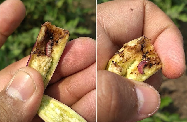 The pest is polyphagous. The full-grown larvae are greenish with dark broken grey lines along the side of the body. They measure about 35-45 mm long. The moth of this pest is quite larger and brownish in color with a V-shaped speck and dull black border on the hind wings. The larvae are first starting their feeding on leaves and fruiting bodies of the plants and at later stages, they bore into the fruits, completely eating away the internal contents.