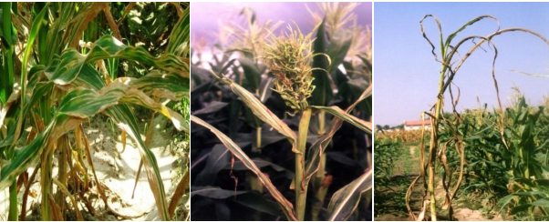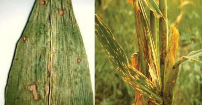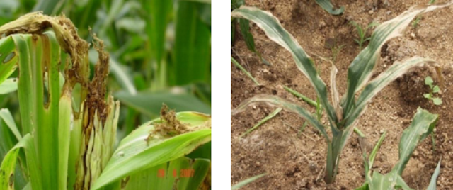 it is a common disease that mainly occurs in the foothills region of the northern states of the country. The visible symptom of the disease is the white lesions on the leaves and sheath of the maize plant. The Purplish or brown horizontal bands are present on white lesions.