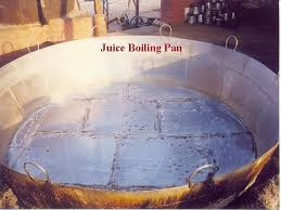 A triple pan arrangement is also employed for making jaggery. The triple pan arrangement is superior to a single pan because it allows better utilization of the heat of the fuel. The filtered juice is received in the first pan closest to the chimney of the furnace, and the heated juice is then transferred to the second pan, where it is boiled and clarified.
